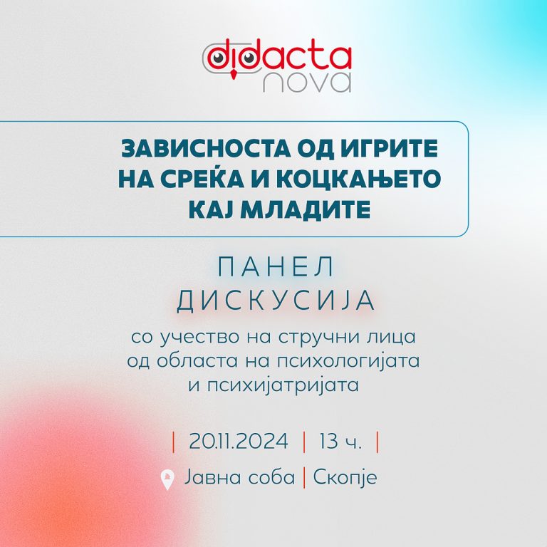 На 20 ноември во „Јавна соба“, со почеток од 13 часот ќе се одржи панел-дискусија на тeма зависност од игрите на среќа и коцкањето кај младите, со учество на стручни лица од областа на психолохијата и психијатријата. Панелот е дел од кампањата „Коцкањето не е игра“ за едукација и подигнување на свесноста од опасностите од зависноста кај младите од коцкање и за справување нејзините ефекти, а поканети се сите психолози, психијатри, педагози и други стручни лица кои се занимаваат со оваа проблематика.